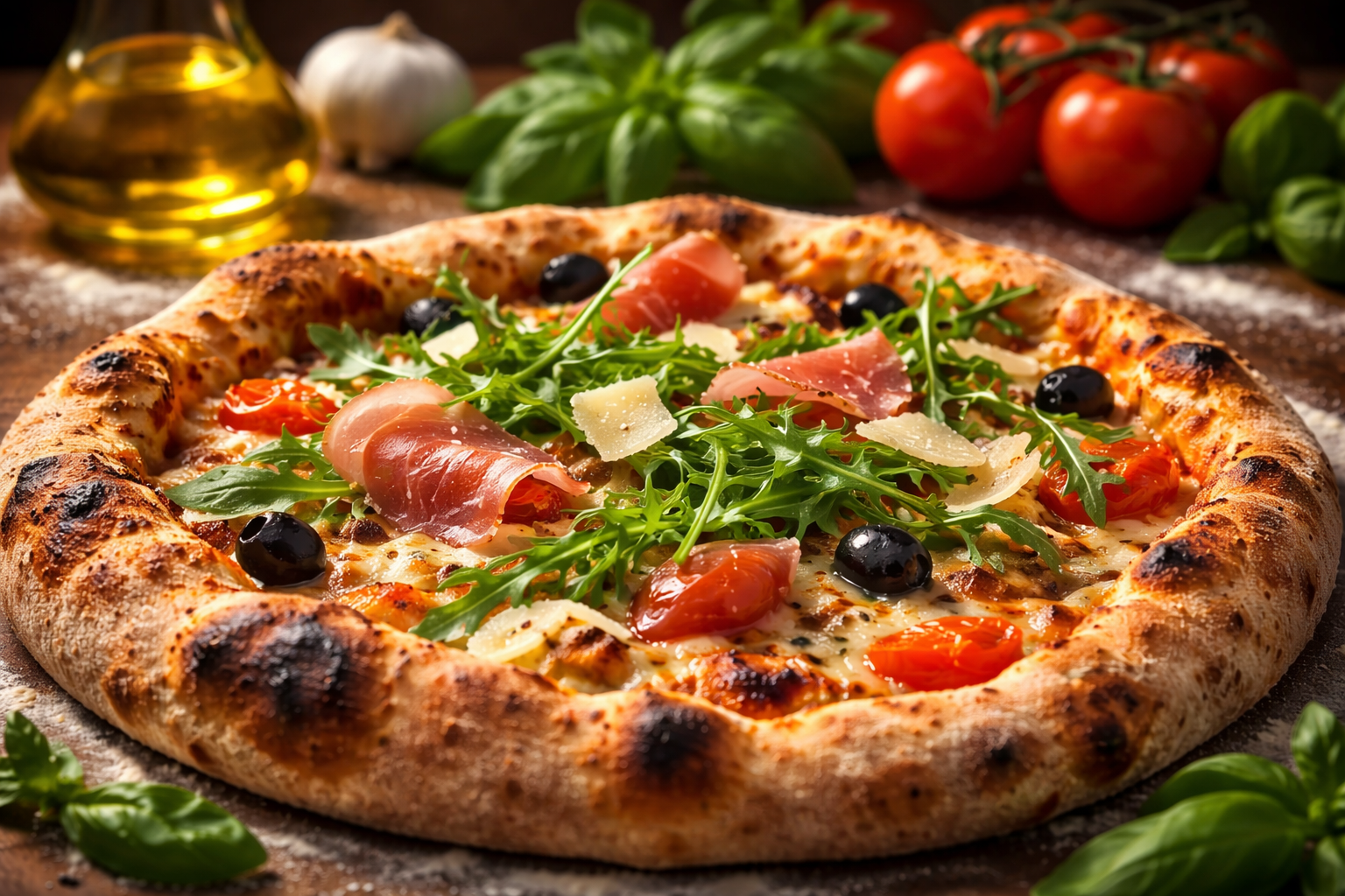Handgemachte Pizza nach sizilianischer Tradition – mit luftigem Teig, knusprigem Rand und frischen Zutaten.
